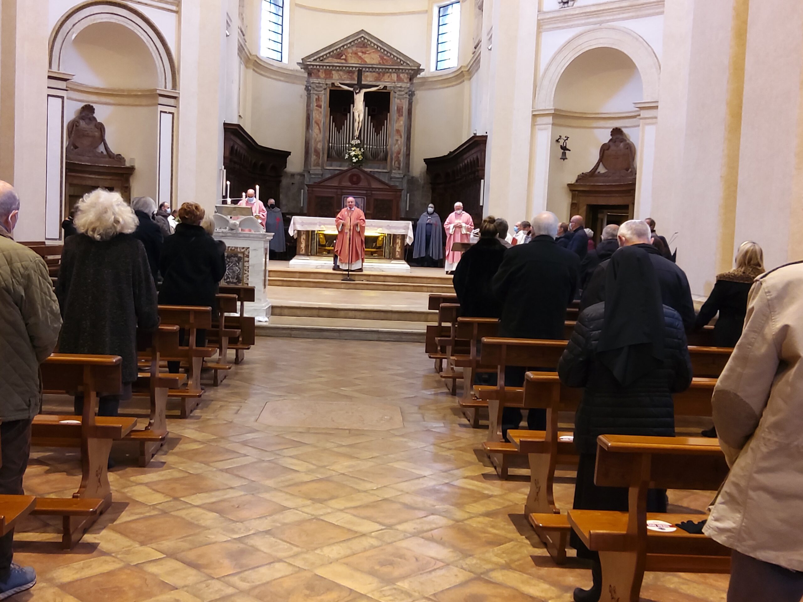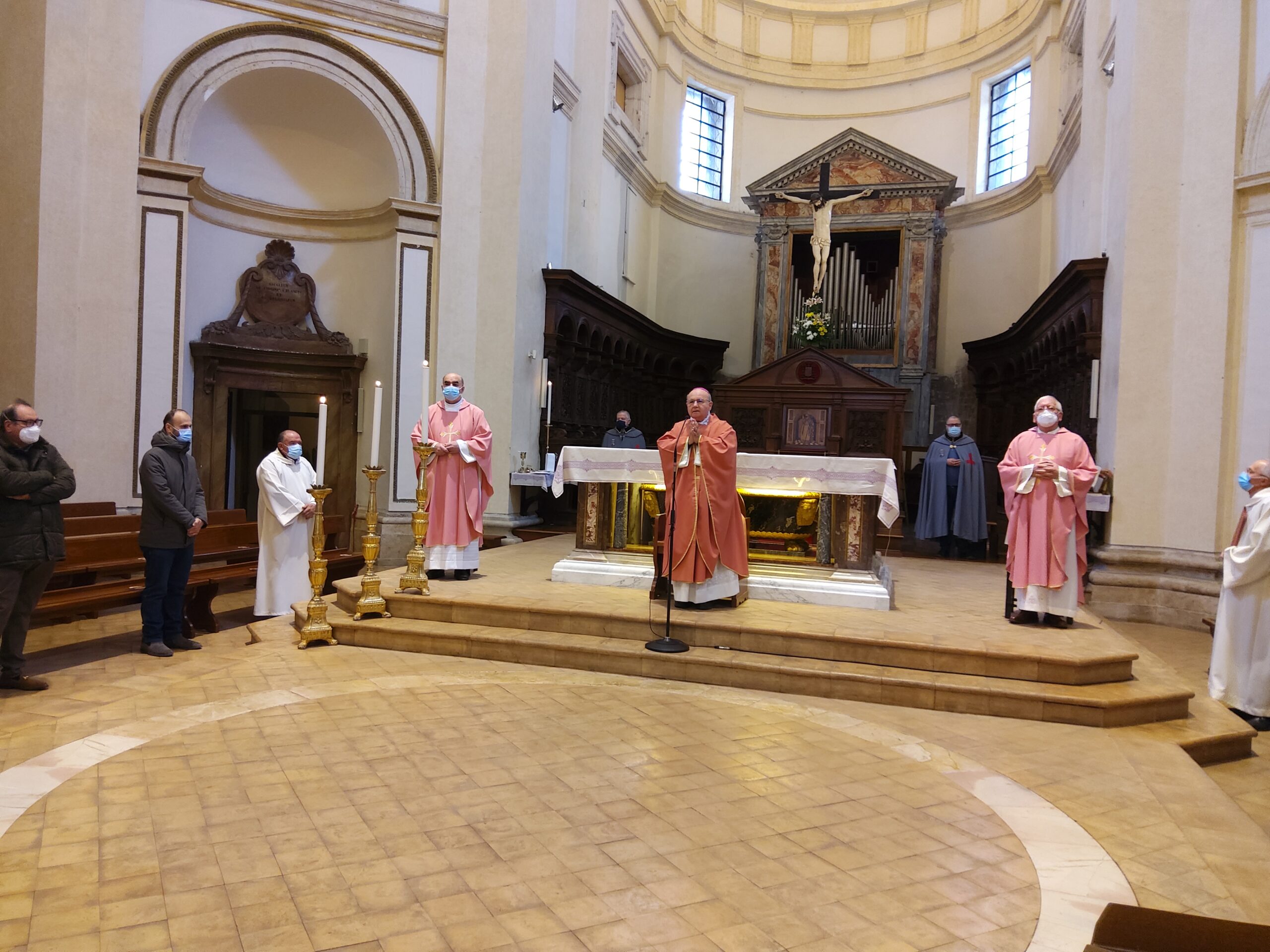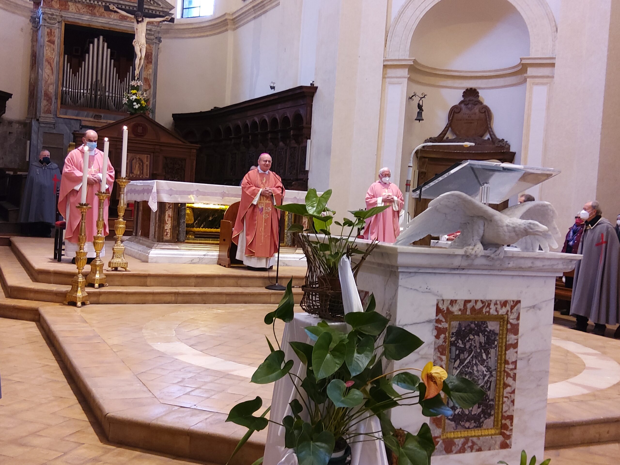 ASSISI - La liturgia di domenica 14 marzo, quarta domenica di Quaresima, si colora di rosa nei suoi paramenti, un colore tenue, una sfumatura tra il viola penitenziale della Quaresima e il bianco luminoso della Pasqua, della luce gioiosa del Risorto che ci attende... si avvicina... Sì, la "Domenica Laetare" ci ricorda che anche nella prova non ci abbandona la certezza che Dio è con noi, è la nostra gioia. Parole di speranza con le quali monsignor Sorrentino ha introdotto la santa messa da lui presieduta domenica mattina nella cattedrale di san Rufino e concelebrata dal parroco don Cesare Provenzi e da don Dario Resenterra. In comunione con tutti i vescovi dell'Umbria, domenica 14 marzo, in tutte le chiese umbre si prega e s'implora il Signore perché conceda all'umanità intera la fine della pandemia, siamo infatti una sola Chiesa.