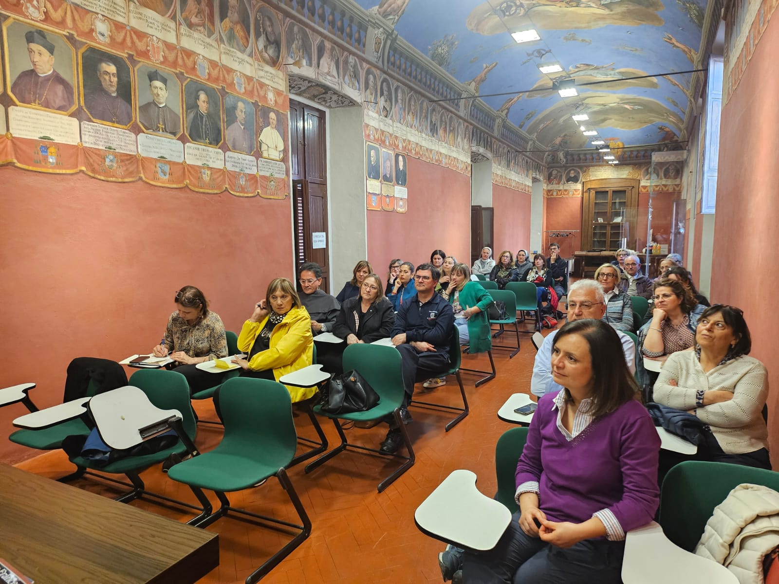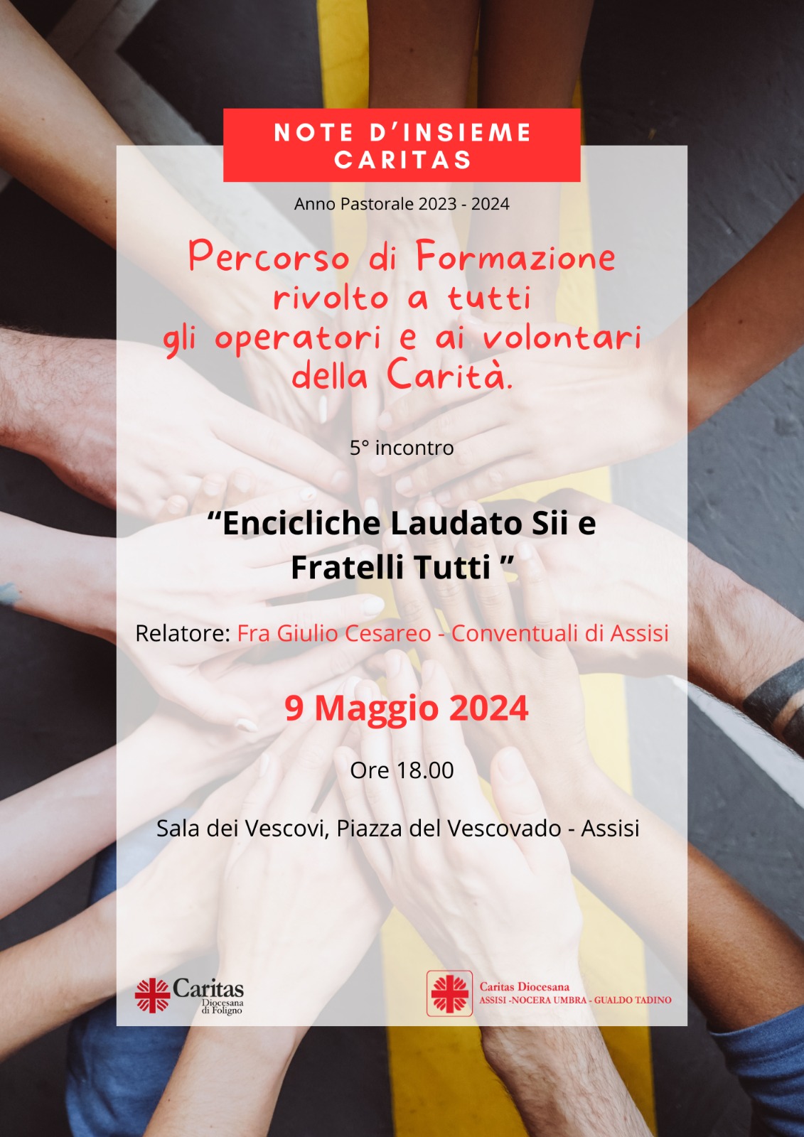 ASSISI – Si sono conclusi giovedì 9 maggio nel pomeriggio gli incontri del percorso di formazione “Note d’insieme Caritas” rivolto agli operatori e ai volontari delle Caritas delle diocesi di Assisi - Nocera Umbra - Gualdo Tadino e di Foligno. Nella sala dei Vescovi del Vescovado di Assisi in tanti hanno partecipato all’incontro sul tema “Encicliche Laudato Sii e Fratelli Tutti” con la relazione di fra Giulio Cesareo, direttore dell’Ufficio comunicazione del Sacro Convento di Assisi.