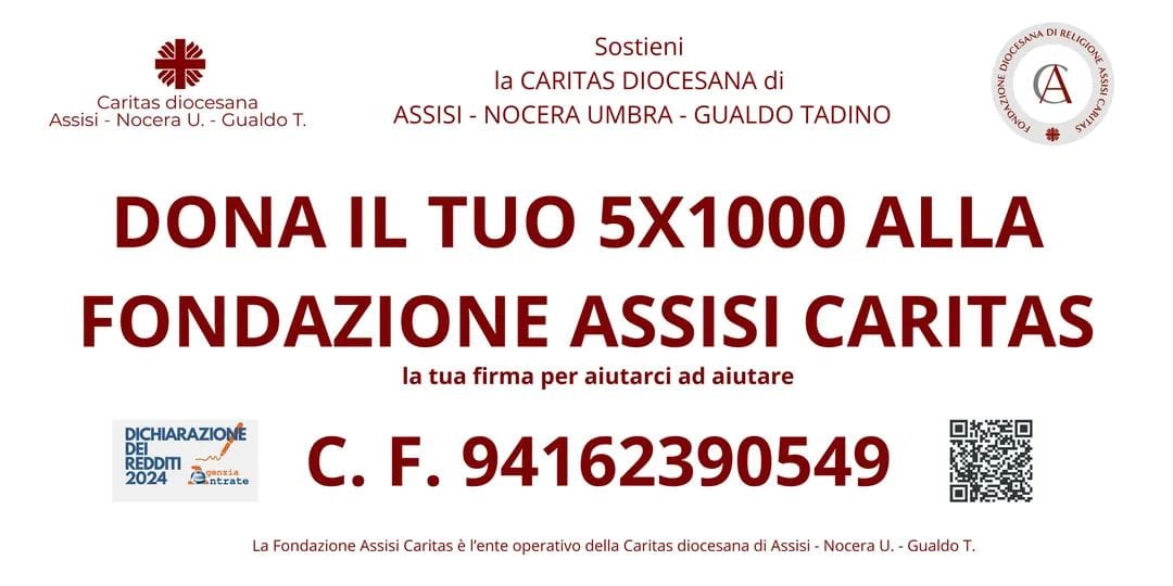 ASSISI – Sostieni la Caritas diocesana di Assisi – Nocera Umbra – Gualdo Tadino donando il 5XMille alla Fondazione Assisi Caritas, l’ente operativo della Caritas stessa.